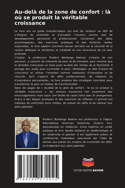Le livre est un guide transformateur qui met les lecteurs au défi de s'éloigner du prévisible et d'accepter l'inconnu comme voie de développement personnel et professionnel. Combinant des idées psychologiques, des exercices pratiques et des histoires réelles inspirantes, le livre explore comment laisser derrière soi la sécurité de la routine débloque la résilience, la créativité et une conscience de soi plus profonde.L'auteur, le professeur Frederic Bontango Kweme, s'inspire de son parcours, y compris de moments de peur et de triomphe, pour montrer que la véritable croissance se situe juste au-delà des limites de la familiarité. Il partage des outils pour surmonter la peur, développer un état d'esprit de croissance et utiliser l'inconfort comme catalyseur d'innovation et de réussite. Qu'il s'agisse de défis professionnels, de relations ou d'aspirations personnelles, ce livre propose des stratégies concrètes pour transformer la peur en moteur de transformation.Dans les pages de « Au-delà de la zone de confort : là où se produit la véritable croissance », les lecteurs trouveront non seulement des encouragements mais aussi une feuille de route claire pour le changement. Grâce à des étapes pratiques et des exercices de réflexion, il permet aux individus de confronter leurs limites, de relever les défis et de réaliser leur plein potentiel.