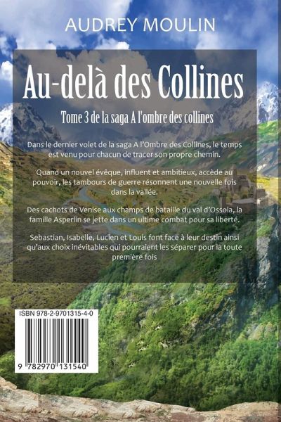 Dans le dernier volet de la saga A l'Ombre des Collines, le temps est venu pour chacun de tracer son propre chemin. Quand un nouvel évêque, influent et ambitieux, accède au pouvoir, les tambours de guerre résonnent une nouvelle fois dans la vallée. Des cachots de Venise aux champs de bataille du val d'Ossola, la famille Asperlin se jette dans un ultime combat pour sa liberté. Sebastian, Isabelle, Lucien et Louis font face à leur destin ainsi qu'aux choix inévitables qui pourraient les séparer pour la toute première fois.