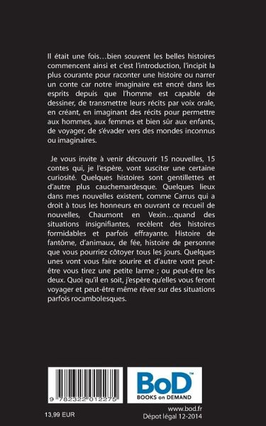 Je vous invite à venir découvrir 15 nouvelles, 15 contes qui, je l espère, vont susciter une certaine curiosité. Quelques histoires sont gentillettes et d autre plus cauchemardesques. Quelques lieux dans mes nouvelles existent, comme Carrus qui a droit à tous les honneurs en ouvrant ce recueil de nouvelles, Chaumont en Vexin quand des situations insignifiantes, recèlent des histoires formidables et parfois effrayantes. Histoires de fantômes, d animaux, de fées, histoire de personnes que vous pourriez côtoyer tous les jours. Quelques unes vont vous faire sourire et d autre vont peut-être vous tirer une petite larme ; ou peut-être les deux. Quoi qu il en soit, j espère qu elles vous feront voyager et peut-être même rêver sur des situations parfois rocambolesques.