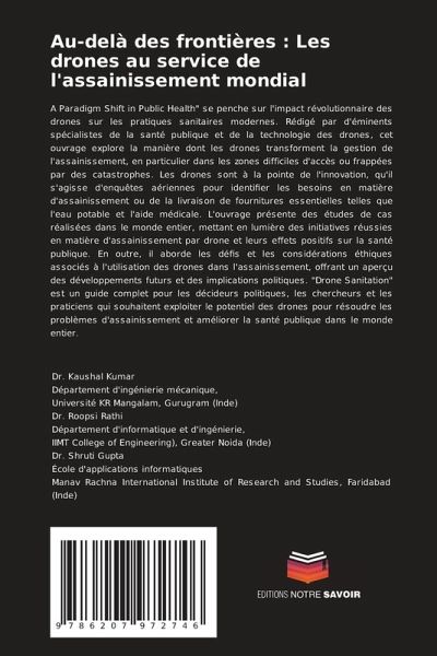 A Paradigm Shift in Public Health" se penche sur l'impact révolutionnaire des drones sur les pratiques sanitaires modernes. Rédigé par d'éminents spécialistes de la santé publique et de la technologie des drones, cet ouvrage explore la manière dont les drones transforment la gestion de l'assainissement, en particulier dans les zones difficiles d'accès ou frappées par des catastrophes. Les drones sont à la pointe de l'innovation, qu'il s'agisse d'enquêtes aériennes pour identifier les besoins en matière d'assainissement ou de la livraison de fournitures essentielles telles que l'eau potable et l'aide médicale. L'ouvrage présente des études de cas réalisées dans le monde entier, mettant en lumière des initiatives réussies en matière d'assainissement par drone et leurs effets positifs sur la santé publique. En outre, il aborde les défis et les considérations éthiques associés à l'utilisation des drones dans l'assainissement, offrant un aperçu des développements futurs et des implications politiques. "Drone Sanitation" est un guide complet pour les décideurs politiques, les chercheurs et les praticiens qui souhaitent exploiter le potentiel des drones pour résoudre les problèmes d'assainissement et améliorer la santé publique dans le monde entier.