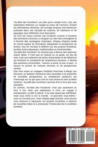 "Au-delà des frontières" est plus qu'un simple livre; c'est une exploration littéraire, un voyage au coeur de l'inconnu. Évitant les affirmations absolues, cet ouvrage propose une immersion profonde dans une myriade de cultures, de traditions et de paysages, tous différents, tous fascinants. Ce livre est conçu comme une invitation ouverte à traverser des territoires inconnus, à naviguer sur des mers étrangères et à franchir des montagnes immenses. Chaque chapitre révèle un nouvel aspect de l'humanité, élargissant la perspective du lecteur, tout en l'incitant à réfléchir sur ses propres frontières, qu'elles soient physiques, intellectuelles ou émotionnelles. "Au-delà des frontières" ne cherche pas à donner des réponses toutes faites. Il n'est pas un manuel ou un guide. Au lieu de cela, il est une collection de récits, d'anecdotes et de réflexions qui éclairent la complexité de l'expérience humaine. Il aborde des questions universelles - l'amour, la perte, la joie, la peur - à travers le prisme de cultures diverses et de perspectives variées. Que vous soyez un voyageur intrépide cherchant à élargir vos horizons, un amateur d'histoires bien racontées à la recherche de nouvelles perspectives, ou simplement quelqu'un qui s'interroge sur ce qui nous unit et nous divise en tant qu'êtres humains, "Au-delà des frontières" pourrait être le livre que vous attendiez. En somme, "Au-delà des frontières" n'est pas seulement un livre à lire, mais une expérience à vivre, un voyage à entreprendre, un défi à relever. Il ne vous laisse pas indifférent, mais vous incite à voir le monde - et peut-être vous-même - sous un nouveau jour. Avec chaque page tournée, vous pouvez vous retrouver à repousser vos propres frontières, à explorer de nouvelles idées et à embrasser l'immensité de la condition humaine.