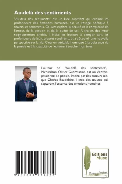 "Au-delà des sentiments" est un livre captivant qui explore les profondeurs des émotions humaines, est un voyage poétique à travers les sentiments. Ce livre explore la beauté et la complexité de l'amour, de la passion et de la quête de soi. À travers des mots soigneusement choisis, il invite les lecteurs à plonger dans les profondeurs de leurs propres sentiments et à découvrir une nouvelle perspective sur la vie. C'est un véritable hommage à la puissance de la poésie et à la capacité de l'écriture à toucher nos âmes.