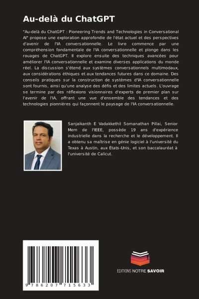 "Au-delà du ChatGPT : Pioneering Trends and Technologies in Conversational AI" propose une exploration approfondie de l'état actuel et des perspectives d'avenir de l'IA conversationnelle. Le livre commence par une compréhension fondamentale de l'IA conversationnelle et plonge dans les rouages de ChatGPT. Il explore ensuite des techniques avancées pour améliorer l'IA conversationnelle et examine diverses applications du monde réel. La discussion s'étend aux systèmes conversationnels multimodaux, aux considérations éthiques et aux tendances futures dans ce domaine. Des conseils pratiques sur la construction de systèmes d'IA conversationnelle sont fournis, ainsi qu'une analyse des défis et des limites actuels. L'ouvrage se termine par des réflexions visionnaires d'experts de premier plan sur l'avenir de l'IA, offrant une vue d'ensemble des tendances et des technologies pionnières qui façonnent le paysage de l'IA conversationnelle.