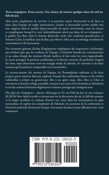 Trois coéquipiers. Deux secrets. Une chance de trouver quelque chose de réel au-delà du jeu. Alex essaie simplement de survivre à sa première année d'université et de faire sa place dans l'équipe de rugby universitaire. Garder sa bisexualité secrète semble être une exigence dans le monde hyper-masculin du sport universitaire, mais les choses se compliquent lorsqu'il se sent indéniablement attiré par deux de ses coéquipiers : le golden boy Ben, dont le charme désinvolte cache une confusion grandissante, et l'intense Chris, le meilleur ami de Ben, qui observe Alex avec un mélange troublant de ressentiment et de fascination. Des moments gênants d'achat d'équipement impliquant des suspensoirs (jockstraps) qui révèlent plus que les couleurs de l'équipe, à l'intimité brutale des entraînements et au calme chargé des sessions d'étude tardives, le lien entre les trois s'approfondit. La sueur partagée, la pression académique et le besoin constant de performer forgent des liens, mais alimentent aussi un triangle tendu de jalousie, de curiosité et de désir naissant qu'ils peinent à comprendre ou à reconnaître. La cocotte-minute des attentes de l'équipe, de l'homophobie ordinaire et de leurs propres peurs internes finit par exploser, forçant des confessions brutes et des vérités vulnérables à éclater au grand jour. Mis à nu après coup, Alex, Ben et Chris se retrouvent à chercher refuge ensemble, menant à une nuit où les frontières se dissolvent et où des contacts hésitants dégénèrent en baisers partagés qui changent tout. Plus Que des Coéquipiers : Amour, Mensonges et Vie Au-Delà du Jeu est une romance M/M/M New Adult torride et émouvante sur la découverte de soi, le défi des attentes et le risque terrifiant et exaltant d'ouvrir son cur dans les circonstances les plus inattendues. Il explore les complexités de l'identité, les pressions de la conformité et l'intimité profonde découverte lorsque trois jeunes hommes osent affronter leurs vrais sentiments.
