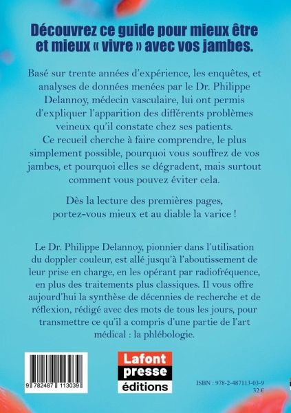 Découvrez ce guide pour mieux être et mieux « vivre » avec vos jambes. Basé sur trente années d¿expérience, les enquêtes et analyses de données menées par le Dr. Philippe Delannoy, médecin vasculaire, lui ont permis d¿expliquer l¿apparition des différents problèmes veineux qüil constate chez ses patients. Ce recueil cherche à faire comprendre, le plus simplement possible, pourquoi vous souffrez de vos jambes, et pourquoi elles se dégradent, mais surtout comment vous pouvez éviter cela. Dès la lecture des premières pages, portez-vous mieux et au diable la varice ! Le Dr. Philippe Delannoy, pionnier dans l¿utilisation du doppler couleur, est allé jusqüà l¿aboutissement de leur prise en charge, en les opérant par radiofréquence, en plus des traitements plus classiques. Il vous offre aujourd¿hui la synthèse de décennies de recherche et de réflexion, rédigé avec des mots de tous les jours, pour transmettre ce qüil a compris d¿une partie de l¿art médical : la phlébologie.