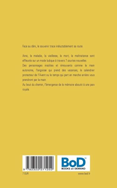 Face au déni, le souvenir trace inéluctablement sa route.Ainsi, la maladie, la vieillesse, la mort, la maltraitance sont effleurés sur un mode ludique à travers 7 courtes nouvelles.Des personnages insolites et émouvants comme la main autonome, l'angoisse qui prend des vacances, le calendrier protecteur de l'Avent ou le temps qui part en marche arrière vous prendront par la main.Au bout du chemin, l'émergence de la mémoire aboutit à une paix royale.
