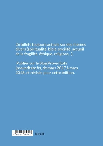 26 billets toujours actuels sur des thèmes divers (spiritualité, bible, société, accueil de la fragilité, éthique, religions...). Publiés sur le blog Proveritate (proveritate.fr), de mars 2017 à mars 2018, et révisés pour cette édition.