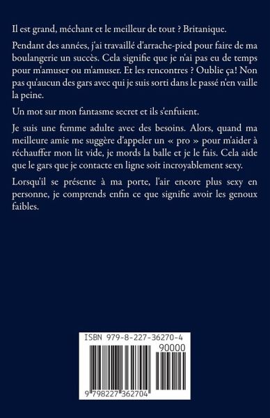 Il est grand, méchant et le meilleur de tout ? Britanique. Pendant des années, j'ai travaillé d'arrache-pied pour faire de ma boulangerie un succès. Cela signifie que je n'ai pas eu de temps pour m'amuser ou m'amuser. Et les rencontres ? Oublie ça! Non pas qu'aucun des gars avec qui je suis sorti dans le passé n'en vaille la peine. Un mot sur mon fantasme secret et ils s'enfuient. Je suis une femme adulte avec des besoins. Alors, quand ma meilleure amie me suggère d'appeler un pro pour m'aider à réchauffer mon lit vide, je mords la balle et je le fais. Cela aide que le gars que je contacte en ligne soit incroyablement sexy. Lorsqu'il se présente à ma porte, l'air encore plus sexy en personne, je comprends enfin ce que signifie avoir les genoux faibles.