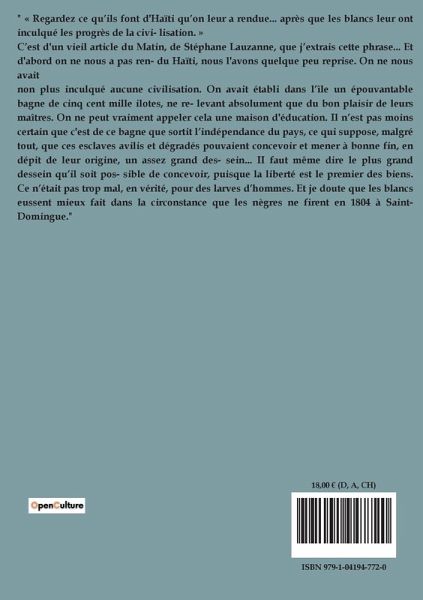 Frédéric Marcelin nous transporte dans l'univers vibrant et complexe de la société haïtienne du début du XXe siècle avec ' Au gré du souvenir '. Ce roman, à la fois introspectif et social, explore les méandres de la mémoire et les répercussions du passé sur le présent. L'histoire se déroule dans un Haïti en pleine mutation, où les tensions politiques et les aspirations individuelles s'entremêlent. Le protagoniste, un homme en quête de rédemption, navigue à travers ses souvenirs, cherchant à comprendre les événements qui ont façonné sa vie et celle de son pays. Les thèmes de l'identité, de la mémoire et de la quête de sens sont au cur de cette uvre littéraire. Marcelin dépeint avec finesse les dilemmes moraux et les choix difficiles auxquels sont confrontés ses personnages, tout en offrant une critique subtile des structures sociales et politiques de son époque. Ce récit psychologique et historique invite le lecteur à réfléchir sur la nature du souvenir et son influence sur notre perception du monde. En développant une narration riche en détails et en émotions, ce livre nous apprend à apprécier la complexité des relations humaines et l'impact des souvenirs sur notre existence. Par une exploration minutieuse des sentiments et des motivations de ses personnages, nous percevons désormais mieux les enjeux personnels et collectifs qui traversent cette période charnière de l'histoire haïtienne.