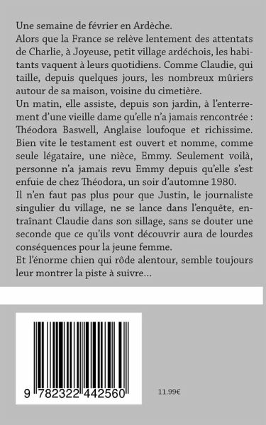 Une semaine de février en Ardèche.Alors que la France se relève lentement des attentats de Charlie, à Joyeuse, petit village ardéchois, les habitants vaquent à leurs quotidiens. Comme Claudie, qui taille, depuis quelques jours, les nombreux mûriers autour de sa maison, voisine du cimetière. un matin, elle assiste, depuis son jardin, à l'enterrement d'une vieille dame qu'elle n'a jamais rencontrée : Théodora Baswell, Anglaise loufoque et richissime. Bien vite le testament est ouvert et nomme, comme seule légataire, une nièce, Emmy. Seulement voilà, personne n'a jamais revu Emmy depuis qu'elle s'est enfuie de chez Théodora, un soir d'automne 1980.Il n'en faut pas plus pour que Justin, le journaliste singulier du village, ne se lance dans l'enquête, entraînant Claudie dans son sillage, sans se douter une seconde que ce qu'ils vont découvrir aura de lourdes conséquences pour la jeune femme. Et l'énorme chien qui rôde alentour, semble toujours leur montrer la piste à suivre...
