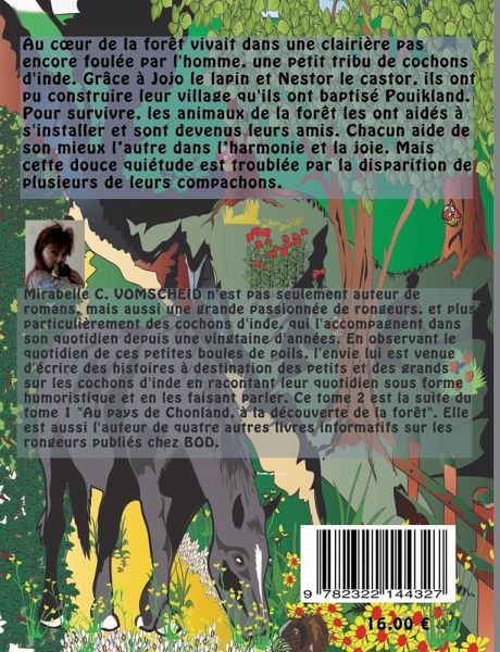Mirabelle C. VOMSCHEID n'est pas seulement auteur de romans, mais aussi une grande passionnée de rongeurs, et plus particulièrement des cochons d'inde, qui l'accompagnent dans son quotidien depuis une vingtaine d'années. En observant le quotidien de ces petites boules de poils, l'envie lui est venue d'écrire un livre à destination des petits et des grands sur les cochons d'inde en racontant leur quotidien sous forme humoristique et en les faisant parler. Ce tome 2 est la suite du tome 1 "Au pays de Chonland, à la découverte de la forêt". Elle est aussi l'auteur de quatre autres livres informatifs sur les rongeurs publiés chez BOD
