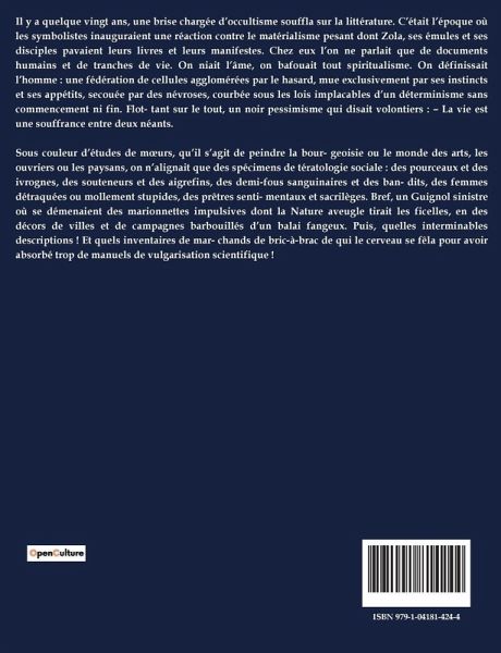 Il y a quelque vingt ans, une brise chargée d¿occultisme souffla sur la littérature. C¿était l¿époque où les symbolistes inauguraient une réaction contre le matérialisme pesant dont Zola, ses émules et ses disciples pavaient leurs livres et leurs manifestes. Chez eux l¿on ne parlait que de documents humains et de tranches de vie. On niait l¿âme, on bafouait tout spiritualisme. On définissait l¿homme : une fédération de cellules agglomérées par le hasard, mue exclusivement par ses instincts et ses appétits, secouée par des névroses, courbée sous les lois implacables d¿un déterminisme sans commencement ni fin. Flot- tant sur le tout, un noir pessimisme qui disait volontiers : ¿ La vie est une souffrance entre deux néants. Sous couleur d¿études de m¿urs, qüil s¿agit de peindre la bour- geoisie ou le monde des arts, les ouvriers ou les paysans, on n¿alignait que des spécimens de tératologie sociale : des pourceaux et des ivrognes, des souteneurs et des aigrefins, des demi-fous sanguinaires et des ban- dits, des femmes détraquées ou mollement stupides, des prêtres senti- mentaux et sacrilèges. Bref, un Guignol sinistre où se démenaient des marionnettes impulsives dont la Nature aveugle tirait les ficelles, en des décors de villes et de campagnes barbouillés d¿un balai fangeux. Puis, quelles interminables descriptions ! Et quels inventaires de mar- chands de bric-à-brac de qui le cerveau se fêla pour avoir absorbé trop de manuels de vulgarisation scientifique !