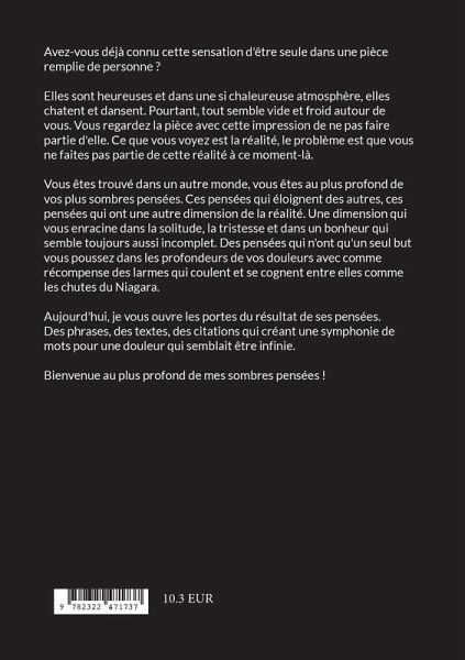 Avez-vous déjà connu cette sensation d'être seule dans une pièce remplie de personne ? Elles sont heureuses et dans une si chaleureuse atmosphère, elles chatent et dansent. Pourtant, tout semble vide et froid autour de vous. Vous regardez la pièce avec cette impression de ne pas faire partie d'elle. Ce que vous voyez est la réalité, le problème est que vous ne faites pas partie de cette réalité à ce moment-là. Vous êtes trouvé dans un autre monde, vous êtes au plus profond de vos plus sombres pensées. Ces pensées qui éloignent des autres, ces pensées qui ont une autre dimension de la réalité. Une dimension qui vous enracine dans la solitude, la tristesse et dans un bonheur qui semble toujours aussi incomplet. Des pensées qui n'ont qu'un seul but vous poussez dans les profondeurs de vos douleurs avec comme récompense des larmes qui coulent et se cognent entre elles comme les chutes du Niagara.Aujourd'hui, je vous ouvre les portes du résultat de ses pensées. Des phrases, des textes, des citations qui créant une symphonie de mots pour une douleur qui semblait être infinie.Bienvenue au plus profond de mes sombres pensées !