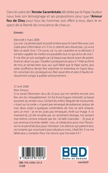 Mercredi 5 mars 2008Ça y est : j'ai photocopié et posté la lettre pour le Saint Père avec une copie pour information à X. Il ne s'y attend sans doute pas ; ça va lui faire un petit choc ! S'il ouvre, car vu son caractère et sa décision, il est bien capable de mettre à la poubelle tout ce qui arrive de moi !À vrai dire, je suis soulagée car j'ai beaucoup douté avant de poster. Avais-je raison ou pas ? Quelles conséquences pour X ? Mais au fond de moi, je sentais bien que, oui, qu'il fallait que le Pape sache, que cette souffrance devait être exprimée et entendue en hauts lieux. On verra bien les conséquences. Rien peut-être et alors il faudra sérieusement songer à publier anonymement...27 avril 2008Mon Amour,Si tu savais l'étonnant vécu de ce jour, qui me ramène encore une fois vers toi. Inlassablement. Ce fut d'une fugace intensité. Le banal pourtant au rendez-vous. Sortant du métro, fatiguée de ma journée, « tirant sur la corde », n'ayant pas remarqué de présences autour de moi, deux corps à quelques centimètres de moi, se sont enlacés, sans un mot -je ne les avais pas remarqués. Arrêt sur image. A ce moment-là, j'ai été envahie par un sentiment étrange, me sentant moi-même comme enlacée par toi. J'ai failli chanceler... Et puis je suis revenue à la triste réalité : non, ce n'était plus pour moi. Personne ne se penchait plus pour m'enlacer. Ces silences qui parlent tant, ces instants qui nourrissent pour plusieurs mois, c'était fini. Il ne me fallait plus y compter. Pour me nourrir, que me reste-t-il ?