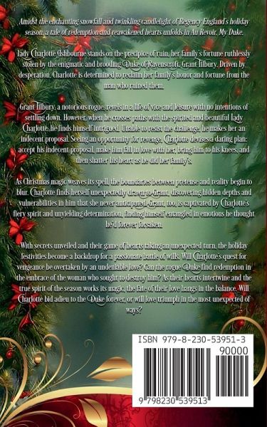 Amidst the enchanting snowfall and twinkling candlelight of Regency England's holiday season, a tale of redemption and reawakened hearts unfolds in Au Revoir, My Duke. Lady Charlotte Ashbourne stands on the precipice of ruin, her family's fortune ruthlessly stolen by the enigmatic and brooding Duke of Ravenscroft, Grant Tilbury. Driven by desperation, Charlotte is determined to reclaim her family's honor and fortune from the man who ruined them. Grant Tilbury, a notorious rogue, revels in a life of vice and leisure with no intentions of settling down. However, when he crosses paths with the spirited and beautiful Lady Charlotte, he finds himself intrigued. Unable to resist the challenge, he makes her an indecent proposal. Seeing an opportunity for revenge, Charlotte devises a daring plan: accept his indecent proposal, make him fall in love with her, bring him to his knees, and then shatter his heart as he did her family's. As Christmas magic weaves its spell, the boundaries between pretense and reality begin to blur. Charlotte finds herself unexpectedly drawn to Grant, discovering hidden depths and vulnerabilities in him that she never anticipated. Grant, too, is captivated by Charlotte's fiery spirit and unyielding determination, finding himself entangled in emotions he thought he'd forever forsaken. With secrets unveiled and their game of hearts taking an unexpected turn, the holiday festivities become a backdrop for a passionate battle of wills. Will Charlotte's quest for vengeance be overtaken by an undeniable love? Can the rogue Duke find redemption in the embrace of the woman who sought to destroy him? As their hearts intertwine and the true spirit of the season works its magic, the fate of their love hangs in the balance. Will Charlotte bid adieu to the Duke forever, or will love triumph in the most unexpected of ways?