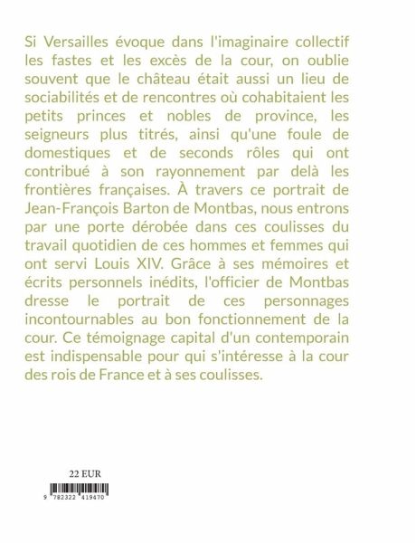 Si Versailles évoque dans l'imaginaire collectif les fastes et les excès de la cour, on oublie souvent que le château était aussi un lieu de sociabilités et de rencontres où cohabitaient les petits princes et nobles de province, les seigneurs plus titrés, ainsi qu'une foule de domestiques et de seconds rôles qui ont contribué à son rayonnement par delà les frontières françaises. À travers ce portrait de Jean-François Barton de Montbas, nous entrons par une porte dérobée dans ces coulisses du travail quotidien de ces hommes et femmes qui ont servi Louis XIV. Grâce à ses mémoires et écrits personnels inédits, l'officier de Montbas dresse le portrait de ces personnages incontournables au bon fonctionnement de la cour. Ce témoignage capital d'un contemporain est indispensable pour qui s'intéresse à la cour des rois de France et à ses coulisses.