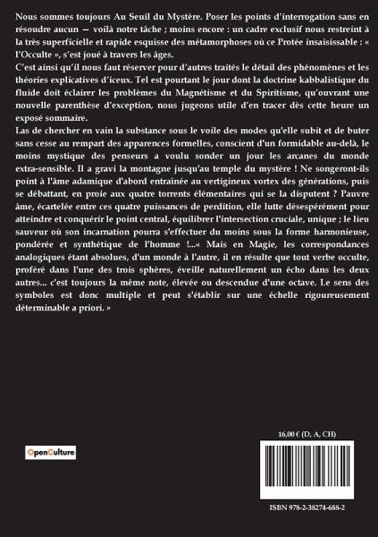 Nous sommes toujours Au Seuil du Mystère. Poser les points d¿interrogation sans en résoudre aucun ¿ voilà notre tâche ; moins encore : un cadre exclusif nous restreint à la très superficielle et rapide esquisse des métamorphoses où ce Protée insaisissable : « l¿Occulte », s¿est joué à travers les âges. C¿est ainsi qüil nous faut réserver pour d¿autres traités le détail des phénomènes et les théories explicatives d¿iceux. Tel est pourtant le jour dont la doctrine kabbalistique du fluide doit éclairer les problèmes du Magnétisme et du Spiritisme, qüouvrant une nouvelle parenthèse d¿exception, nous jugeons utile d¿en tracer dès cette heure un exposé sommaire. Las de chercher en vain la substance sous le voile des modes qu'elle subit et de buter sans cesse au rempart des apparences formelles, conscient d'un formidable au-delà, le moins mystique des penseurs a voulu sonder un jour les arcanes du monde extra-sensible. Il a gravi la montagne jusqu'au temple du mystère ! Ne songeront-ils point à l'âme adamique d'abord entraînée au vertigineux vortex des générations, puis se débattant, en proie aux quatre torrents élémentaires qui se la disputent ? Pauvre âme, écartelée entre ces quatre puissances de perdition, elle lutte désespérément pour atteindre et conquérir le point central, équilibrer l'intersection cruciale, unique ; le lieu sauveur où son incarnation pourra s'effectuer du moins sous la forme harmonieuse, pondérée et synthétique de l'homme !...« Mais en Magie, les correspondances analogiques étant absolues, d'un monde à l'autre, il en résulte que tout verbe occulte, proféré dans l'une des trois sphères, éveille naturellement un écho dans les deux autres... c'est toujours la même note, élevée ou descendue d'une octave. Le sens des symboles est donc multiple et peut s'établir sur une échelle rigoureusement déterminable a priori. »
