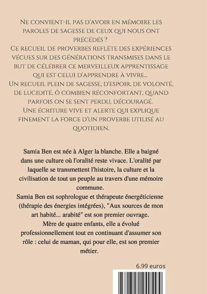 J'ai répertorié vingt-neuf citations de sagesse populaire Algériennes. Je les écrits en arabe, les traduits au mieux et je les explique en mettant en avant, la sagesse, le développement humain dans lesquels ils étaient déja! Prendre conscience que la sagesse est universelle et qu'elle ne connait aucune frontière et qu'au contraire, elle résiste à l'épreuve du temps. C'est aussi un hommage que je fais aux anciens, aux miens mais également à mon défunt père. Je parle également de moi, de mon histoire, de mon parcours de vie.