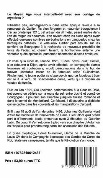 Le Moyen Age vous interpelle-t-il avec son cortège de mystères ?N'hésitez pas, immergez-vous dans cette époque révolue à la remorque de Galtier, fils d'un forgeron et heaumier bourguignon ! Car au printemps 1215, cet artisan du vil métal, passé maître dans l'art de forger les heaumes, s'en revient chez les siens après avoir effectué quelques sombres pérégrinations en Languedoc chez les hérétiques cathares. Le valeureux Galtier part ensuite sur les sentiers de Bourgogne à la recherche de nouveaux procédés de fonte de l'acier, et, chemin faisant, le bonhomme entame une véritable quête spirituelle, parsemée néanmoins d'actes érotiques.Or voilà qu'à Noël de l'année 1226, Eudes, neveu dudit Galtier, s'en retourne à Dijon, après avoir effectué, en compagnie d'amis trouvères et troubadours, moult pérégrinations dans le but de trouver l'ineffable trésor de la fameuse reine Guilhalmier. Finalement, le jeune poète va s'apercevoir que ce fabuleux trésor est lié à la vertu de l'inaccessible dame, vertu qui a disparu en volutes de fumée.Puis en l'an 1391, Gui Lhelmier, parlementaire à la Cour de Dole, entreprend un périple sur la route du sel, entre duché et comté de Bourgogne ; il poursuit son itinéraire jusqu'en Suisse romande et dans le comté de Montbéliard. Ce faisant, il découvrira la diablerie qui se cache dans les couvents et les manipulations d'argent.Enfin, au 15 août de l'an de grâce 1496, Johannes Guillemier vient d'être fait bachelier de l'Université de Paris. C'est alors qu'il prend part à d'étonnants ébats amoureux avec 3 ribaudes du Quartier Latin. Du coup, il s'en retourne à pied vers son chapitre d'Autun où on l'appelle pour prendre rang parmi les chanoines des Eduens.En guise d'épilogue, Edme Guillemier, Garde de la Manche de Louis XV dans la Compagnie écossaise des Gardes du Corps du Roi, relate ses campagnes, tandis que la Révolution s'annonce.
