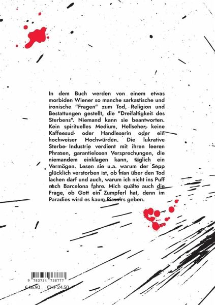 In dem Buch werden von einem etwas morbiden Wiener so manche sarkastische und ironische "Fragen" zum Tod, Religion und Bestattungen gestellt, die "Dreifaltigkeit des Sterbens". Niemand kann sie beantworten. Kein spirituelles Medium, Hellseher, keine Kaffeesud- oder Handleserin oder ein hochweiser Hochwürden. Die lukrative Sterbe-Industrie verdient mit ihren leeren Phrasen, garantielosen Versprechungen, die niemandem einklagen kann, täglich ein Vermögen. Lesen sie u.a. warum der Sepp glücklich verstorben ist, ob man über den Tod lachen darf und auch, warum ich nicht ins Puff nach Barcelona fahre. Mich quälte auch die Frage, ob Gott ein Zumpferl hat, denn im Paradies wird es kaum Pissoirs geben.
