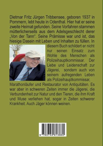 Dietmar Fritz Jürgen Tribbensee, geboren 1937 in Pommern, lebt heute in Odenthal. Hier hat er seine zweite Heimat gefunden. Seine Vorfahren stammen mütterlicherseits aus dem Adelsgeschlecht derer "von der Tann". Seine Prämisse war und ist, das hiesige Dasein mit Leben und Inhalten zu füllen. In diesem Buch schildert er nicht nur seinen Einsatz zum Wohle des Menschen als Polizeihauptkommissar. Der Liebe und Leidenschaft zur Jägerei, sondern auch von seinem aufregenden Leben als Polizeihauptkommissar, Marathonläufer und Restaurator von Antiquitäten. Es war aber in schweren Zeiten immer die Jägerei, die Verbundenheit zur Natur und den Tieren, die ihm Kraft und Muße verliehen hat, sogar in Zeiten schwerer Krankheit.
