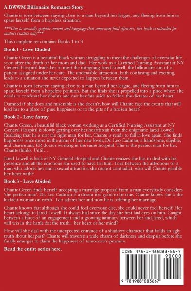 A BWWM Billionaire Romance Story Chante is torn between staying close to a man beyond her league, and fleeing from him to spare herself from a hopeless situation. ***Due to sexually graphic content and language that some may find offensive, this book is intended for mature readers only*** This complete set contains Books 1 to 3 Book 1 - Love Eluded Chante Green is a beautiful black woman struggling to meet the challenges of everyday life soon after the death of her mom and dad. Her work as a Certified Nursing Assistant at NY General Hospital leads her to meet the intriguing Jared Lowell, the billionaire son of a patient assigned under her care. The undeniable attraction, both confusing and exciting, leads to a situation she never expected to happen between them. Chante is torn between staying close to a man beyond her league, and fleeing from him to spare herself from a hopeless position. But she finds she is propelled into a place where she needs to confront her doubts and cast her fate aside to follow the dictates of her heart. Damned if she does and miserable is she doesn’t, how will Chante face the events that will lead her to a place of pure happiness or to the pits of a broken heart? Book 2 - Love Astray Chante Green, a beautiful black woman working as a Certified Nursing Assistant at NY General Hospital is slowly getting over her heartbreak from the enigmatic Jared Lowell. Realizing that he is not the right man for her, Chante is ready to fall in love again. She finds happiness once more in the arms of her new lover, Dr. Leo Cadman, a handsome, eligible, and charismatic ER doctor working in the same hospital. This is the perfect man for her, Chante thinks. Until… Jared Lowell is back at NY General Hospital and Chante realizes she has to deal with his presence and all the emotions she used to have for him. Torn between the affections of a man who adores her and a sexual attraction she cannot contradict, who will Chante gamble her heart with? Book 3 - Love Abided Chante Green finds herself accepting a marriage proposal from a man everybody considers ‘the perfect man’. Dr. Leo Cadman is a dream too good to be true. Chante knows she is the luckiest woman on earth. Leo adores her and now he is offering her marriage. Chante knows that although she could fool everyone else, she could never fool herself. Her heart belongs to Jared Lowell. It always had since the day she first laid eyes on him. Caught between a farce of an engagement and a growing intimacy between her and Jared, which will win in the battle for the truth... her heart or her mind? How will she deal with the unexpected entrance of a shadowy character that holds an ugly truth about her past? Chante will traverse a wide chasm of darkness and despair before she finally emerges to claim the happiness of tomorrow’s promise. Read the entire series here.