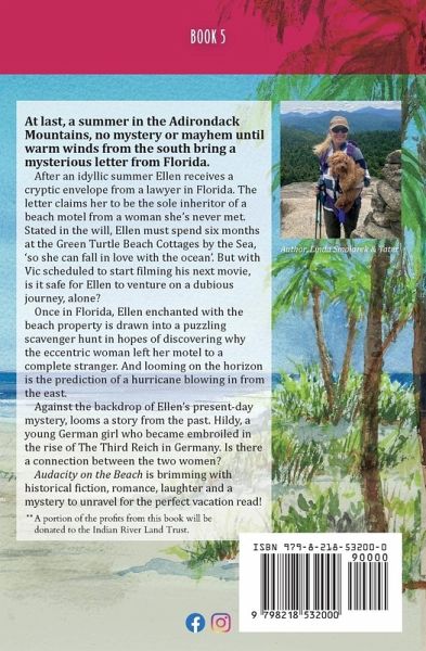 At last, a summer in the Adirondack Mountains, no mystery or mayhem until warm winds from the south bring a letter from Florida. After an idyllic summer Ellen receives a cryptic envelope from a lawyer in Florida. The letter claims her to be the sole inheritor of a beach motel from a woman she's never met. Stated in the will, Ellen must spend six months at the Green Turtle Beach Cottages by the Sea, 'so she can fall in love with the ocean'. But with Vic scheduled to start filming a new movie, is it safe for Ellen to venture on a dubious journey, alone? Once in Florida, Ellen enchanted with the beach property is drawn into a puzzling scavenger hunt in hopes of discovering why the eccentric woman left her motel to a complete stranger. And looming on the horizon is the prediction of a hurricane blowing in from the east. Against the backdrop of Ellen's present-day mystery, looms a story from the past. Hildy, a young German girl who became embroiled in the rise of The Third Reich in Germany. Is there a connection between the two woman? Audacity on the Beach is brimming with historical fiction, romance, laughter and a mystery to unravel for the perfect vacation read!