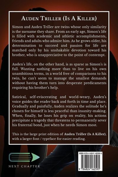 Simon and Auden Triller are twins whose only similarity is the surname they share. From an early age, Simon's life is filled with academic and athletic accomplishments, friends and adults who admire him. As he grows older, his determination to succeed and passion for life are matched only by his unshakable devotion toward his brother, who is unappreciative to the point of contempt. Auden's life, on the other hand, is as sparse as Simon's is full. Wanting nothing more than to live on his own unambitious terms, in a world free of comparisons to his twin, he can't seem to manage the smallest demands without having them turn into desperate predicaments requiring his brother's help. Satirical, self-eviscerating and world-weary, Auden's voice guides the reader back and forth in time and place. Gradually and painfully, Auden realizes the solitude he's chosen for himself is less peaceful than insanity-making. When, finally, he loses his grip on reality, his actions precipitate a tragedy that threatens to permanently sever his fraternal bond, just when he needs Simon most. This is the large print edition of Auden Triller (Is A Killer), with a larger font / typeface for easier reading.