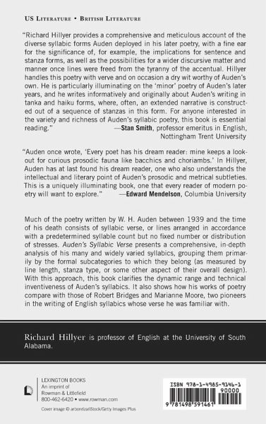 This book presents a comprehensive and in-depth analysis of W. H. Auden's many syllabics, revealing them as highly various in both form and content. It also discusses his achievement in relation to the work of two pioneers in the writing of English syllabic verse: Robert Bridges and Marianne Moore.