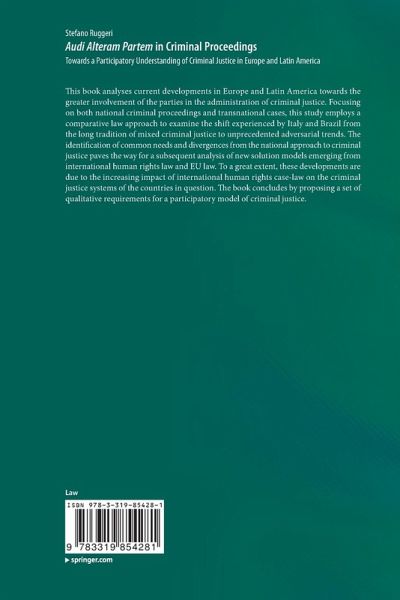 Part I - Introduction to the Research: 1. Preliminary issues.- Part II - Audi Alteram Partem in National Criminal Justice. The Perspective of Domestic Law: 2. Participatory Rights in Italian Criminal Justice and the Developments Towards a Contradictoire-based Model of Criminal Proceedings.- 3. Participatory Rights in Brazilian Law and the Requirements of Contradictoire and Full Defence in Criminal Proceedings.- Part III - Audi Alteram Partem in Transnational Criminal Justice. The Perspective of Domestic Law: 4. Participatory Rights in Transnational Criminal Justice Under Italian Law.- 5. Participatory Safeguards in Transnational Criminal Justice Under Brazilian Law.- Part IV - Convergences and Divergences in the National Understanding of Participatory Rights in Domestic and Transnational Criminal Justice: 6. Common Developments and Deficiencies of the Domestic Approach to Participatory Safeguards in Criminal Proceedings.-7. Similarities and Shortcomings of the National Understanding of Participatory Rights in the Field of Transnational Criminal Justice.- Part V - Evolution of a Wideranging Participatory Approach to Criminal Justice in International Human Rights Law and EU Law: 8. Audi Alteram Partem in Criminal Proceedings Under the European Convention on Human Rights.- 9. Participatory Rights in Criminal Justice Under the American Convention on Human Rights.- 10. Harmonisation of Criminal Justice and Participatory Rights in Criminal Proceedings. New Developments in EU Law After the Lisbon Treaty.- Part VI - Developments in International and Supranational Law Towards a Participatory Understanding of Transnational Criminal Justice: 11. Participatory Rights in Transnational Criminal Justice Under the European Convention.- 12. Audi Alteram Partem in Transnational Cases Under the American Convention.- 13. Defence Rights and Participatory Guarantees Acknowledged by EU Law in theInternational Cooperation Within the Area of Freedom, Security and Justice.- Part VII - Solution Models and Principles of a Participatory Approach to Criminal Justice in International Human Rights Law and EU Law: 14. Common Principles of a Participatory Model of Criminal Proceedings in International Human Rights Law and EU Law.- 15. Solution Models for a Participatory Approach to Transnational Criminal Justice in International and Supranational Law.- Part VIII - De-formalisation of Legal Systems and Reconstruction of a Participatory Model of Criminal Justice: 16. Mutual Interaction of Systems of Human Rights Protection and the Development of a Participatory Understanding of Criminal Justice Based on Transcultural Dialogues.- 17. Concluding Findings. Proposals and Qualitative Requirements of a Participatory Model of Criminal Justice.