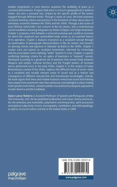 Audible Geographies in Latin America examines the audibility of place as a racialized phenomenon. It argues that place is not just a geographical or political notion, but also a sensorial one, shaped by the specific profile of the senses engaged through different media. Through a series of cases, the book examines racialized listening criteria and practices in the formation of ideas about place at exemplary moments between the 1890s and the 1960s. Through a discussion of Louis Moreau Gottschalk's last concerts in Rio de Janeiro, and a contemporary sound installation involving telegraphs by Otávio Schipper and Sérgio Krakowski, Chapter 1 proposes a link between a sensorial economy and a political economy for which the racialized and commodified body serves as an essential feature of its operation. Chapter 2 analyzes resonance as a racialized concept through an examination of phonograph demonstrations in Rio de Janeiro and research on dancing manias and hypnosis in Salvador daBahia in the 1890s. Chapter 3 studies voice and speech as racialized movements, informed by criminology and the proscriptive norms defining "white" Spanish in Cuba. Chapter 4 unpacks conflicting listening criteria for an optics of blackness in "national" sounds, developed according to a gendered set of premises that moved freely between diaspora and empire, national territory and the fraught politics of recorded versus performed music in the early 1930s. Chapter 5, in the context of Cuban Revolutionary cinema of the 1960s, explores the different facets of noise-both as a racialized and socially relevant sense of sound and as a feature and consequence of different reproduction and transmission technologies. Overall, the book argues that these and related instances reveal how sound and listening have played more prominent roles than previously acknowledged in place-making in the specific multi-ethnic, colonial contexts characterized by diasporic populations in Latin America and theCaribbean.