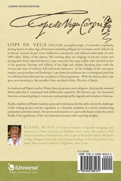 LOPE DE VEGA (1562-1635), poet/playwright of unrivaled popularity during Spain's Golden Age of literature (including Miguel de Cervantes and Calderón de la Barca), rescued theater from ineffective conventions and claimed authorship of some 1800 titles. Many of the almost 500 existing plays are stagings of pivotal events and protagonists from national history. Lope entertains his eager public with colorful stories of the passions, heroism and villainy of the high and mighty blending these with the virtues and vices of ordinary folk and stock characters. In the twilight of the once great empire, now powerless and bankrupt, Lope draws his audience into a reimagined past that is confirmed and redeemed by a prophecy of future greatness. With the history play Lope gives new meaning to the moniker often ascribed to him, Phoenix of Spain. In Audiences of Empire, author Elaine Bunn proposes a new subgenre, the populist national history play that is communal and deliberately expansive. She shows Lope, the frustrated historian, connecting king to commoner and putting myths, legends and miracles to fresh use. Finally, Audiences of Empire includes a personal reminiscence by the author about the challenges of the writing process and her experience as a feminist academic in a slowly transforming patriarchal university system. Her protracted research on Lope's early theater makes her aware finally of the significance of her own historical moment with surprising insights.