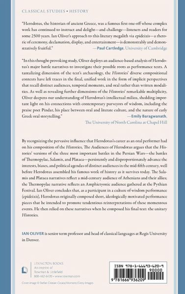 By recognizing the pervasive influence that Herodotus's career as an oral performer had on his composition of the Histories, The Audiences of Herodotus: Oral Performance and the Battle Narratives argues that the Histories' versions of the three most important battles in the Persian Wars-the battles of Thermopylae, Salamis, and Plataea-persistently and disproportionately advance the interests, biases, and political agendas of distinct audiences in the mid-fifth century, well before Herodotus assembled his famous work of history as it survives to us. The Salamis and Plataea narratives reflect a mid-century audience of Athenians and their allies; the Thermopylae narrative reflects an Amphictyonic audience gathered at the Pythian Festival. Ian Oliver concludes that, as a participant in a culture of wisdom performance (epideixis), Herodotus originally composed short, ideologically motivated performance pieces that he intended to promote tendentious reinterpretations of these momentous events, then relied on these narratives when he composed his final text: the unitary Histories.