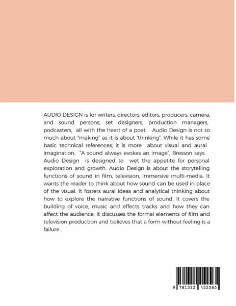AUDIO DESIGN is for writers, directors, editors, producers, camera, and sound persons, set designers, production managers, podcasters, all with the heart of a poet. Audio Design is not so much about "making" as it is about 'thinking". While it has some basic technical references and "how to" guidelines, it is more about visual and aural imagination. "A sound always evokes an image", Bresson says. Audio Design is designed to wet the appetite for personal exploration and growth. . Audio Design is about the storytelling functions of sound in film, television, multi-media. It wants the reader to think about how sound can be used creatively in place of the visual. It fosters aural ideas and analytical thinking about how to explore the narrative functions of sound. It covers the building of voice, music and effects tracks and how they can affect the audience. It discusses the formal elements of film and television production and believes that a form without feeling is a failure.