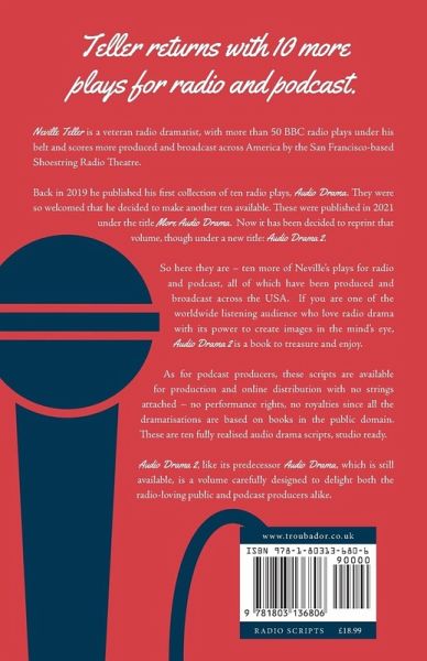 Neville Teller is a veteran radio dramatist, with more than 50 BBC radio plays under his belt and scores more produced and broadcast across America by the San Francisco-based Shoestring Radio Theatre. Back in 2019 he published his first collection of ten radio plays, Audio Drama. They were so welcomed that he decided to make another ten available. These were published in 2021 under the title More Audio Drama. Now it has been decided to reprint that volume, though under a new title: Audio Drama 2. So here they are - ten more of Neville's plays for radio and podcast, all of which have been produced and broadcast across the USA. If you are one of the worldwide listening audience who love radio drama with its power to create images in the mind's eye, Audio Drama 2 is a book to treasure and enjoy. As for podcast producers, these scripts are available for production and online distribution with no strings attached - no performance rights, no royalties since all the dramatisations are based on books in the public domain. These are ten fully realised audio drama scripts, studio ready. Audio Drama 2, like its predecessor Audio Drama, which is still available, is a volume carefully designed to delight both the radio-loving public and podcast producers alike.