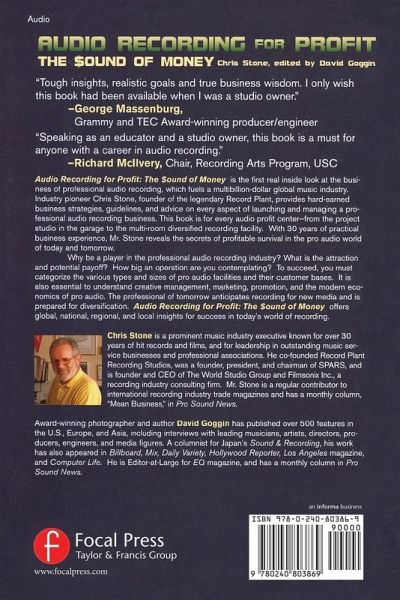 This book is the first real inside look at the business of professional audio recording, which fuels a multibillion dollar global music industry. Industry pioneer Chris Stone, founder of the legendary Record Plant, provides hard-earned business strategies, guidelines, and advice on every aspect of launching and managing a professional audio recording business. This book is for every audio profit center - from the project studio in the garage to the multi-room diversified recording facility. With 30 years of practical business experience, Mr. Stone reveals the secrets of profitable survival in the pro audio world of today and tomorrow. Why be a player in the professional audio recording industry? What is the attraction and potential payoff? How big an operation are you contemplating? To succeed, one must categorize the various types and sizes of pro audio facilities and their customer bases. It is also essential to understand creative management, marketing, promotion, and the modern economics of pro audio. The professional of tomorrow anticipates recording for new media and is prepared for diversification. All of these issues and more are addressed in this book.