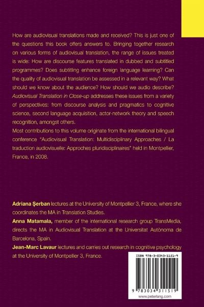 How are audiovisual translations made and received? This is just one of the questions this book offers answers to. Bringing together research on various forms of audiovisual translation, the range of issues treated is wide: How are discourse features translated in dubbed and subtitled programmes? Does subtitling enhance foreign language learning? Can the quality of audiovisual translation be assessed in a relevant way? What should we know about the audience? How should we audio describe? Audiovisual Translation in Close-up addresses these issues from a variety of perspectives: from discourse analysis and pragmatics to cognitive science, second language acquisition, actor-network theory and speech recognition, amongst others. Most contributions to this volume originate from the international bilingual conference «Audiovisual Translation: Multidisciplinary Approaches/La traduction audiovisuelle : Approches pluridisciplinaires» held in Montpellier, France, in 2008.