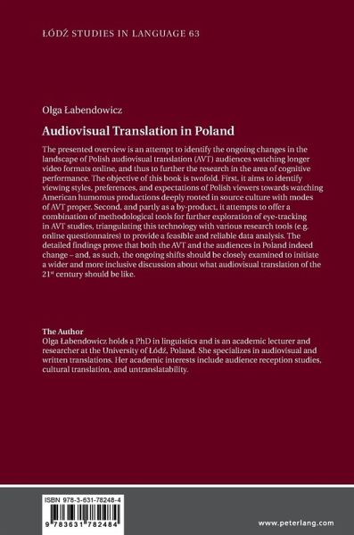 The presented overview is an attempt to identify the ongoing changes in the landscape of Polish audiovisual translation (AVT) audiences watching longer video formats online, and thus to further the research in the area of cognitive performance. The objective of this book is twofold. First, it aims to identify viewing styles, preferences, and expectations of Polish viewers towards watching American humorous productions deeply rooted in source culture with modes of AVT proper. Second, and partly as a by-product, it attempts to offer a combination of methodological tools for further exploration of eye-tracking in AVT studies, triangulating this technology with various research tools (e.g. online questionnaires) to provide a feasible and reliable data analysis. The detailed findings prove that both the AVT and the audiences in Poland indeed change - and as such, the ongoing shifts should be closely examined to initiate a wider and more inclusive discussion about what audiovisual translation of the 21st century should be like.