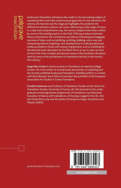 RACHELE ANTONINI is a researcher at the University of Bologna, Italy FRANCESCA BARTRINA is a lecturer in Translation Studies at the University of Vic., Spain LUKASZ BOGUCKI is works Associate Professor and Head of Translation Studies, Department of English Language of Lód? University JONATHAN BURTON is a surtitler at the Royal Opera House, Covent Garden, London, UK ANNAMARIA CAIMI is Associate Professor of English Language and Linguistics at Pavia University, Italy SUSANA CAÑUELO SARRIÓN works as a freelance translator and university teacher. DELIA CHIARO holds a chair in English Linguistics at the University of Bologna's Advanced School in Modern Languages for Interpreters and Translators at Forlì, Italy MARIO DE BORTOLI works for Euro RSCG 4D LUCILE DESBLACHE is Reader in French and Translation at Roehampton University, London, UK PANAYOTA GEORGAKOPOULOU is the Managing Director of the European Captioning Institute ANDREW HOLLAND is head of description at the National Theatre, London, UK JESÚS MAROTO ORTIZ-SOTOMAYOR is at the Universitat Rovira i Virgili, Italy JOSÉLIA NEVES teaches Audiovisual Translation at the Polytechnic Institute of Leiria and at the University of Coimbra, in Portugal PILAR ORERO is a Lecturer at Universitat Autònoma de Barcelona (UAB), Spain, where she coordinates the Online Master in Audiovisual Translation. TOMOYUKI SHIBAHARA is a freelance interpreter, translator and lecturer, working inJapan ERIK SKUGGEVIK is a lecturer in Audiovisual Translation at the University of Surrey, UK STAVROULA SOKOLI is a tutor in Spanish at the Hellenic Open University, Greece and a professional subtitler CHRISTOPHER TAYLOR is Professor of English Language and Translation at the University of Trieste, Italy, where he is Head of the Language Centre. JAN EMIL TVEIT is Associate Professor at the Norwegian School of Economics and Business Administration in Bergen, Norway