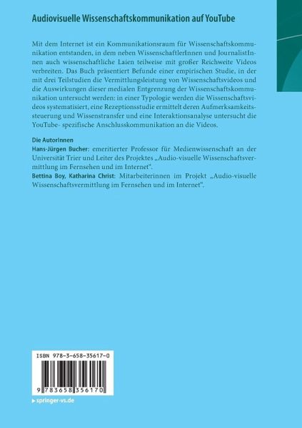 Mit dem Internet ist ein Kommunikationsraum für Wissenschaftskommunikation entstanden, in dem neben WissenschaftlerInnen und JournalistInnen auch wissenschaftliche Laien teilweise mit großer Reichweite Videos verbreiten. Das Buch präsentiert Befunde einer empirischen Studie, in der mit drei Teilstudien die Vermittlungsleistung von Wissenschaftsvideos und die Auswirkungen dieser medialen Entgrenzung der Wissenschaftskommunikation untersucht werden: in einer Typologie werden die Wissenschaftsvideos systematisiert, eine Rezeptionsstudie ermittelt deren Aufmerksamkeitssteuerung und Wissenstransfer und eine Interaktionsanalyse untersucht die YouTube-spezifische Anschlusskommunikation an die Videos.