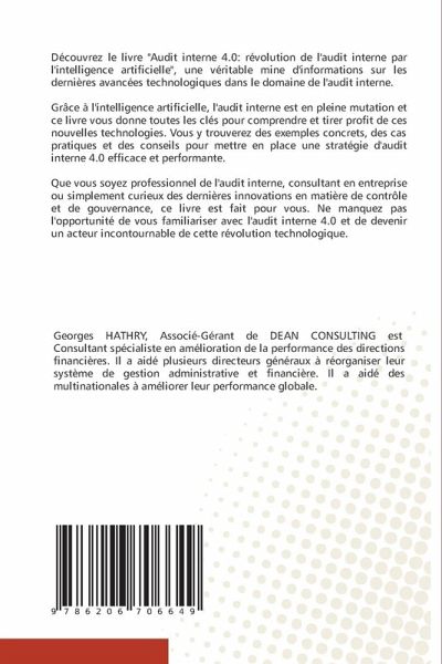 Découvrez le livre "Audit interne 4.0: révolution de l'audit interne par l'intelligence artificielle", une véritable mine d'informations sur les dernières avancées technologiques dans le domaine de l'audit interne.Grâce à l'intelligence artificielle, l'audit interne est en pleine mutation et ce livre vous donne toutes les clés pour comprendre et tirer profit de ces nouvelles technologies. Vous y trouverez des exemples concrets, des cas pratiques et des conseils pour mettre en place une stratégie d'audit interne 4.0 efficace et performante.Que vous soyez professionnel de l'audit interne, consultant en entreprise ou simplement curieux des dernières innovations en matière de contrôle et de gouvernance, ce livre est fait pour vous. Ne manquez pas l'opportunité de vous familiariser avec l'audit interne 4.0 et de devenir un acteur incontournable de cette révolution technologique.