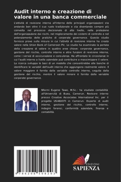 L'attività di revisione interna all'interno delle principali organizzazioni sta andando ben oltre il suo ruolo tradizionale e sta diventando sempre più coinvolta nel processo decisionale di alto livello, nella protezione dell'organizzazione dai rischi, nel miglioramento dei sistemi di controllo e nel potenziamento delle pratiche di corporate governance. Questo studio fornisce prove sulla misura in cui l'attività di revisione interna ha creato valore nella Union Bank of Cameroon Plc. Lo studio ha esaminato la portata della creazione di valore in quattro aree chiave: corporate governance, gestione del rischio, controllo interno e altre funzioni di revisione interna, come i servizi di assicurazione e consulenza. Ha affrontato le circostanze in cui l'audit interno a livello aziendale può contribuire a massimizzare il valore. La ricerca sviluppa le basi di un modello che consentirebbe alle banche di identificare le variabili dell'audit interno che aggiungono realmente valore. Il valore maggiore è fornito dalla variabile controllo interno, seguita dalla gestione del rischio, mentre il valore minore è fornito dalla variabile corporate governance.