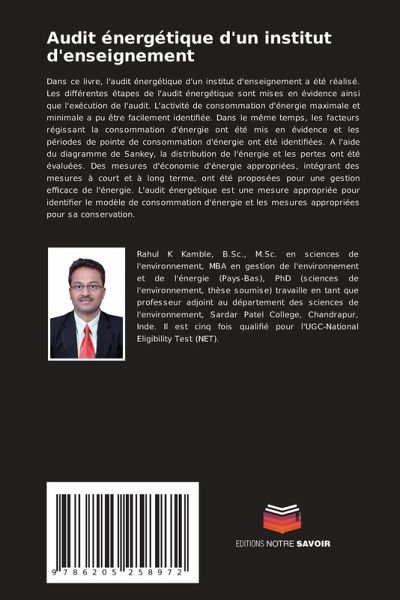 Dans ce livre, l'audit énergétique d'un institut d'enseignement a été réalisé. Les différentes étapes de l'audit énergétique sont mises en évidence ainsi que l'exécution de l'audit. L'activité de consommation d'énergie maximale et minimale a pu être facilement identifiée. Dans le même temps, les facteurs régissant la consommation d'énergie ont été mis en évidence et les périodes de pointe de consommation d'énergie ont été identifiées. A l'aide du diagramme de Sankey, la distribution de l'énergie et les pertes ont été évaluées. Des mesures d'économie d'énergie appropriées, intégrant des mesures à court et à long terme, ont été proposées pour une gestion efficace de l'énergie. L'audit énergétique est une mesure appropriée pour identifier le modèle de consommation d'énergie et les mesures appropriées pour sa conservation.