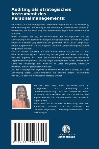 Im Hinblick auf ein strategisches Personalmanagement war es notwendig, die Bewertung der Lehrleistung an der Fakultät für Geisteswissenschaften zu überprüfen, um die Einhaltung der bestehenden Regeln und Vorschriften zu ermitteln.Unser Hauptziel war es, die Auswirkungen der Prüfungspraxis auf die Lehrleistung in Hochschuleinrichtungen zu diagnostizieren. Zu diesem Zweck haben wir siebzehn (17) Standards ausgearbeitet, die in unser Compliance-Raster aufgenommen und als Fragen in unserem Datenerhebungsinstrument umgestaltet wurden.Diese Standards basierten auf dem Präsidialerlass 121/20 vom 27. April über die Evaluierung der Lehrleistung im Teilsystem der Hochschulbildung, und das Ergebnis war, dass die Fakultät für Geisteswissenschaften im Allgemeinen eine positive Leistung zeigte (insbesondere in den Dimensionen Lehre und Forschung), aber wenn wir im Detail analysieren, finden wir Hinweise, die korrigiert werden müssen.Auf der Grundlage der Ergebnisse kommen wir zu dem Schluss, dass die Anwendung dieser Audit-Compliance die Effizienz dieses Instruments beweist, so dass die Hypothesen bestätigt wurden.