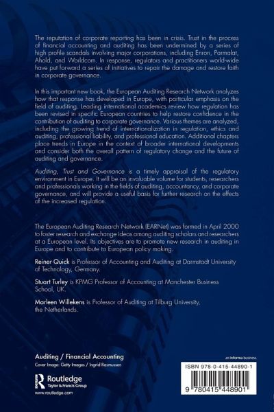 The reputation of corporate reporting has been in crisis. Trust in the process of financial accounting and auditing has been undermined by a series of high profile scandals involving major corporations, including Enron, Parmalat, Ahold, and Worldcom. In response, regulators and practitioners world-wide have put forward a series of initiatives to repair the damage and restore faith in corporate governance. In this important book, the European Auditing Research Network analyzes how that response has developed in Europe, with particular emphasis on the field of auditing. Leading international academics review how regulation has been revised in specific European countries to help restore confidence in the contribution of auditing to corporate governance. Various themes are explored, including the growing trend of internationalization in regulation, ethics and auditing, professional liability, and professional education. Auditing, Trust and Governance is an invaluable volume for students, researchers and professionals working in the fields of auditing, accountancy and corporate governance, and provides a useful basis for further research on the effects of the increased regulation.