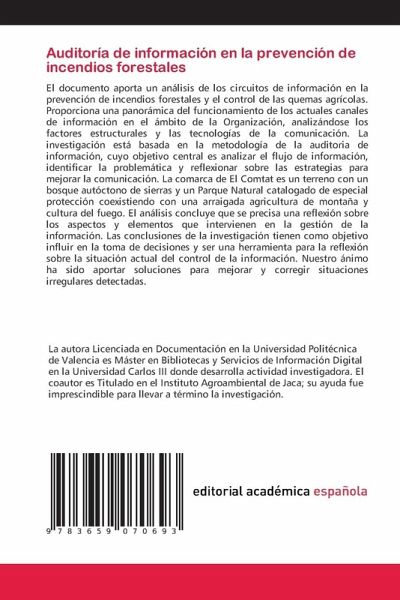 El documento aporta un análisis de los circuitos de información en la prevención de incendios forestales y el control de las quemas agrícolas. Proporciona una panorámica del funcionamiento de los actuales canales de información en el ámbito de la Organización, analizándose los factores estructurales y las tecnologías de la comunicación. La investigación está basada en la metodología de la auditoria de información, cuyo objetivo central es analizar el flujo de información, identificar la problemática y reflexionar sobre las estrategias para mejorar la comunicación. La comarca de El Comtat es un terreno con un bosque autóctono de sierras y un Parque Natural catalogado de especial protección coexistiendo con una arraigada agricultura de montaña y cultura del fuego. El análisis concluye que se precisa una reflexión sobre los aspectos y elementos que intervienen en la gestión de la información. Las conclusiones de la investigación tienen como objetivo influir en la toma de decisiones y ser una herramienta para la reflexión sobre la situación actual del control de la información. Nuestro ánimo ha sido aportar soluciones para mejorar y corregir situaciones irregulares detectadas.