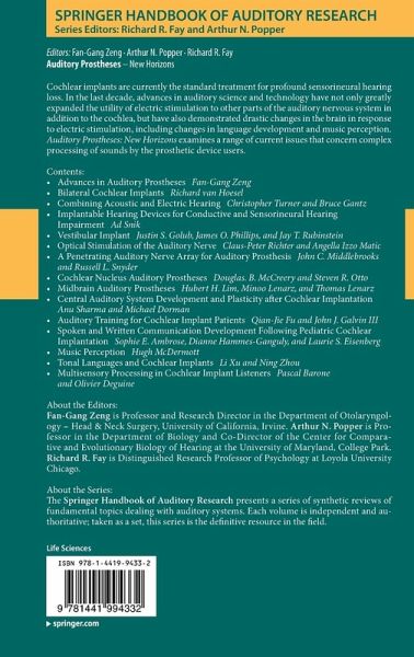 "Each chapter provides insight into an application of an auditory prosthetic device. ... It is written for individuals interested in hearing research, particularly graduate students and clinical investigators. ... written by an expert in that field. ... This volume expands on one published seven years ago, covering advances in hearing research and the use of auditory prosthetic devices that have occurred since then. It provides evidence-based data, making it very useful to researchers in the hearing sciences." (Inna Athar Husain, Doody's Review Service, January, 2012)