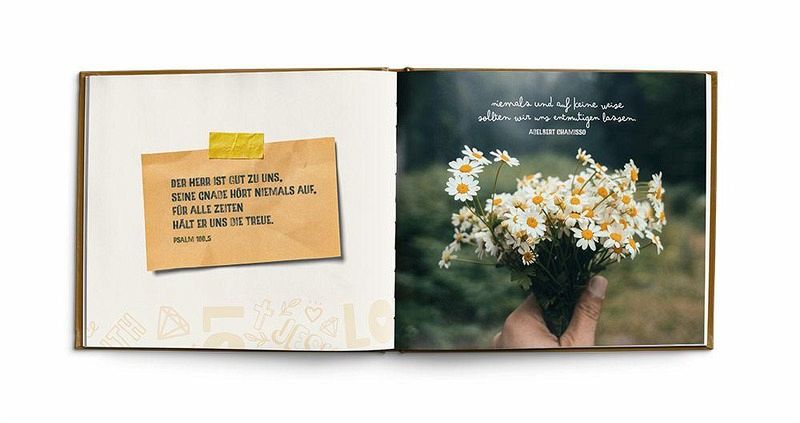 In diesem schönen Buch befindet sich auf jeder Seite ein Bibelvers, Zitat oder ein schöner Spruch. Passend zu diesem wurde der Hintergrund mit einem Bild gestaltet. Jedem einzelnen Bild kann man ansehen, mit wie viel Liebe und Geduld es ausgesucht wurde.