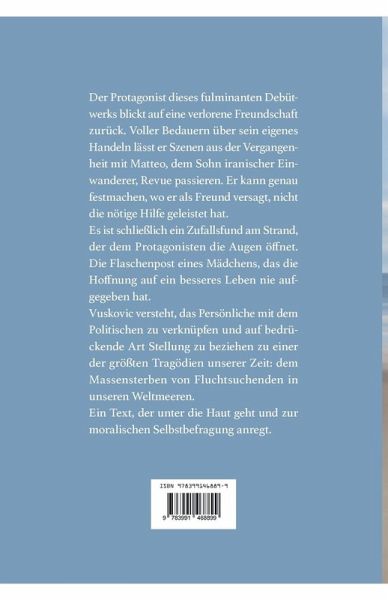 Der Protagonist dieses fulminanten Debütwerks blickt auf eine verlorene Freundschaft zurück. Voller Bedauern über sein eigenes Handeln lässt er Szenen aus der Vergangenheit mit Matteo, dem Sohn iranischer Einwanderer, Revue passieren. Er kann genau festmachen, wo er als Freund versagt, nicht die nötige Hilfe geleistet hat.Es ist schließlich ein Zufallsfund am Strand, der dem Protagonisten die Augen öffnet. Die Flaschenpost eines Mädchens, das die Hoffnung auf ein besseres Leben nie aufgegeben hat. Vuskovic versteht, das Persönliche mit dem Politischen zu verknüpfen und auf bedrückende Art Stellung zu beziehen zu einer der größten Tragödien unserer Zeit: dem Massensterben von Fluchtsuchenden in unseren Weltmeeren. Ein Text, der unter die Haut geht und zur moralischen Selbstbefragung anregt.