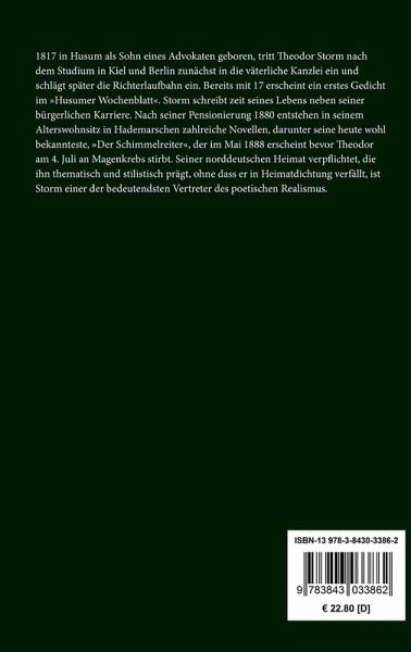 1817 in Husum als Sohn eines Advokaten geboren, tritt Theodor Storm nach dem Studium in Kiel und Berlin zunächst in die väterliche Kanzlei ein und schlägt später die Richterlaufbahn ein. Bereits mit 17 erscheint ein erstes Gedicht im "Husumer Wochenblatt". Storm schreibt zeit seines Lebens neben seiner bürgerlichen Karriere. Nach seiner Pensionierung 1880 entstehen in seinem Alterswohnsitz in Hademarschen zahlreiche Novellen, darunter seine heute wohl bekannteste, "Der Schimmelreiter", der im Mai 1888 erscheint bevor Theodor am 4. Juli an Magenkrebs stirbt. Seiner norddeutschen Heimat verpflichtet, die ihn thematisch und stilistisch prägt, ohne dass er in Heimatdichtung verfällt, ist Storm einer der bedeutendsten Vertreter des poetischen Realismus.
